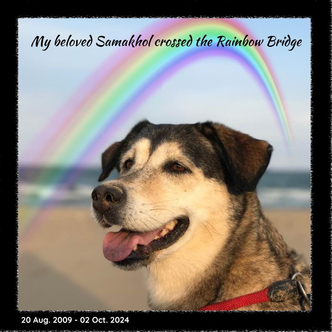 El pasado día 2 de octubre del 2024 mi alma gemela ha dejado atrás el precioso cuerpo de su última encarnación... Al preguntarle qué nombre le gustaría cuando nació, me mostró un gran corazón, así que la llamé "Samakhol", que en Wolof (Senegalés) significa "Mi Corazón". Nació y vivió 15 años bajo ese signo, el del corazón, viviendo cada instante con alegría, por difícil que fuera. Como todos los perros, mientras están con su humano escogido, son felices; ella además seguía feliz cuando tenía que pasar algunas temporadas con un "Pet Sitter", un cuidador de perros, cuando yo tenía que viajar sin ella, y naturalmente cuando se quedaba en casa de mis padres con aquella gran manada de perros y humanos, donde todos la querían. Porque se hacía querer, esta alma sabia, cuyo propósito era justamente el de traer alegría a este mundo. Samakhol me impulsó a escribir mi libro sobre la muerte, precisamente para eliminar el tabú y quitarle el mal sabor de boca a la transición que todos los seres vivos hacemos una y otra vez, pasando de habitar un cuerpo físico a volver a ser la energía libre y multidimensional que somos. Su intención era hacernos comprender la alegría de este proceso, entendiendo que la alegría por el alma que se va, viene siempre combinada con la tristeza por la pérdida del cuerpo físico. Ahí es donde me encuentro en estos momentos, transitando un profundo duelo, porque mi fiel compañera de aventuras ya no está conmigo de la misma forma que lo hizo durante 15 años. Eso son muchos años organizando mi vida entorno a la suya, mis costumbres adaptadas a sus rutinas, mis idas y venidas considerando sus necesidades. Ahora la casa está muy vacía, porque mi gato Felix es un espíritu libre que solo viene para comer cuando no ha cazado nada importante, y a veces para dormir. Cuando Samakhol se fue, Felix pasó un día entero en mi cama, sin salir ni comer, haciendo su duelo por quien era como su madre adoptiva, ya que él perdió la suya al poco de nacer. Pero ellos hacen un duelo mucho más rápido que nosotros porque no se aferran tanto al físico como lo hacemos nosotros. Para Felix la vida ya sigue... Para mí también sigue, pero no igual. Ahora tengo que aprender a vivir sin ella. Cuando lo pienso me pongo a llorar. Entonces recuerdo que ella ahora está libre de un cuerpo que ya no funcionaba, qua ahora vuelve a ser pura consciencia eterna, y entonces me vuelve la alegría que ella me enseñó. Recuerdo tantos y tantos momentos felices que hemos tenido juntas, los primeros meses con sus hermanitos; la suerte de crecer con su madre, la preciosa "Alaska"; las mudanzas, que no le importaban mientras estuviera conmigo; las largas caminatas; la playa en invierno, su segunda favorita después de la nieve; nuestros viajes en autocaravana por el sudoeste americano; prefiero no pensar mucho en el difícil vuelo de ida que tuvo metida en la bodega, pero luego la registré como "Emotinal Support Dog", una fantástica solución americana gracias a la cual pudo entrar conmigo en parques naturales, restaurantes y eventos, además de regresar conmigo en cabina en el vuelo de regreso a España; inteligente y sensible como era, se adaptaba a todas las situaciones sin llamar la atención, poniéndomelo fácil a pesar de su considerable tamaño de Labrador-Malamute y sus 25 Kg de peso. ¡Samakhol era una crack! Ahora su precioso cuerpo descansa junto al de la pequeña Minnie. Y me vuelven a venir las lágrimas a los ojos. Hasta que leo de nuevo las palabras que me dijo el día de su fallecimiento: "La transición de un estado al otro es una celebración de vida. Tenlo siempre en tu mente - porque tu corazón ya lo sabe. Todas las emociones de alegría y celebración vienen del corazón. Todas las emociones de culpa y tristeza vienen de la mente. Reconócelas - y entonces déjalas ir. Todo esto es un ejercicio de "dejar ir". Aprende, practica el dejar ir todo aquello que sea pesado, todo lo que no venga desde el corazón. Sí, la tristeza también viene de la mente porque su origen se halla en juicios y la falta de aceptación del momento presente. Esto es lo que quiero enseñarte en este último acto: dejar ir..." Y así voy alternando pena con alegría, alegría con pena. Lo bonito es que gracias a sus enseñanzas he aprendido a hacer un duelo consciente y lo vivo con la presencia que ella me ha enseñado. En mi libro todavía os hable de la ilusión que me hacía saber que su alma se iba a volver a encarnar en otro cuerpo de perro, como lo había estado haciendo durante siglos. Entretanto he podido saber que no solo hace siglos, sino milenios que estamos juntas. Que de hecho éramos una sola alma que se dividió en dos para aumentar nuestro rango de experiencias, como hacen muchas almas, y que ella casi siempre me ha acompañado en forma de perro en todas nuestras encarnaciones. Una verdadera alma gemela, ¡la misma alma en dos cuerpos! Y por lo que me han dicho tres personas expertas en la conexión con lo sutil, parece que la parte del alma que estaba encarnada en Samakhol, ya ha terminado su ciclo de encarnaciones. Nuevamente me pone triste saber ahora que no la voy a volver a tener en el físico a mi lado, sin embargo la alegría que siento porque ella haya alcanzado lo que todas las almas buscamos, es inmensamente superior a mi tristeza. ¡Lágrimas de alegría! Ahora me queda por confirmar si su parte de nuestra alma se volverá a juntar con la mía y con ello volveremos a ser UNA... --------------------- Celebration of life for Samakhol Last October 2nd, 2024 my soul mate has left behind the precious body of her last incarnation.... When I asked her what name she would like when she was born, she showed me a big heart, so I named her "Samakhol", which in Wolof (Senegalese) means "My Heart". She was born and lived 15 years under that sign, the sign of the heart, living every moment with joy, no matter how difficult it was. Like all dogs, as long as they